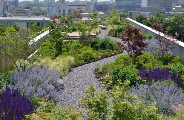 Los jardines en azoteas se encuentran con mayor frecuencia en entornos urbanos densificados. Las plantas tienen la capacidad de reducir la absorción de calor general del edificio, lo que reduce el consumo de energía. … Los jardines de azotea y los techos verdes son obviamente muy beneficiosos para reducir los efectos de la temperatura contra los techos sin jardines.
