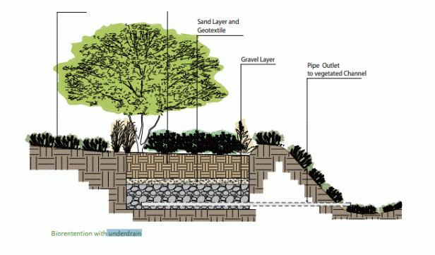 ES una práctica de control de la calidad del agua y la cantidad de agua que utiliza las propiedades químicas, biológicas y físicas de las plantas, los microbios y los suelos para eliminar los contaminantes de la escorrentía de las aguas pluviales. La biorretención depende de los procesos de limpieza natural que ocurren en la comunidad del suelo / mantillo / planta, y establece un sistema de autoperpetuación si está diseñado adecuadamente. Las instalaciones de biorretención capturan la escorrentía de aguas pluviales que luego se filtra a través de un medio de suelo preparado. Los sedimentos y los sólidos en suspensión quedan atrapados en la capa de mantillo antes de ingresar al suelo.