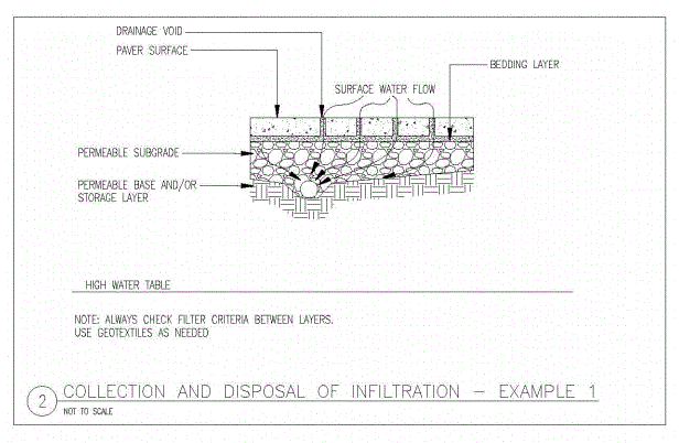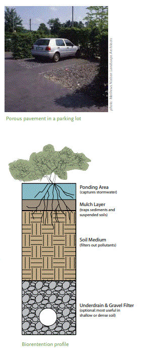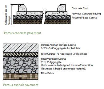 Se trata de pavimentos de asfalto u hormigón en los que las finas partículas más pequeñas en la mezcla de materiales agregados que las comprenden se han mantenido al mínimo para permitir que las aguas pluviales pasen a través del pavimento. Debajo de la capa porosa del pavimento hay un lecho de piedra limpia uniformemente nivelado con un espacio vacío mínimo del 40%, colocado en una profundidad suficiente para atrapar y almacenar un volumen calculado de agua de lluvia a medida que drena a través de él. La parte inferior del lecho de piedra está subyacente con una tela de filtro para permitir que el agua se infiltre en el suelo nativo y para evitar que el suelo migre hacia los huecos de la base de piedra. Cuando se planifican áreas para ser pavimentadas con pavimentos permeables, es importante tener en cuenta que la permeabilidad de los subgrados del suelo subyacentes generalmente es menor que las tasas de infiltración de la superficie, por lo que es una buena práctica diseñar la capa base para poder almacenar el 100% de el volumen de aguas pluviales previsto para infligir el área.