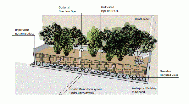 El sistema funciona manteniendo la escorrentía y permitiendo que los contaminantes se depositen a medida que se infiltra la escorrentía. Criterios de diseño básicos: · La dimensión mínima es de 1´5 metro en cualquier dirección y debe dimensionarse según el evento de lluvia, el área de escorrentía contributiva y la tasa de infiltración del suelo nativo; · La capa superficial del suelo instalada debe tener una tasa de infiltración de 5 l./ h; · Se recomienda el desagüe .