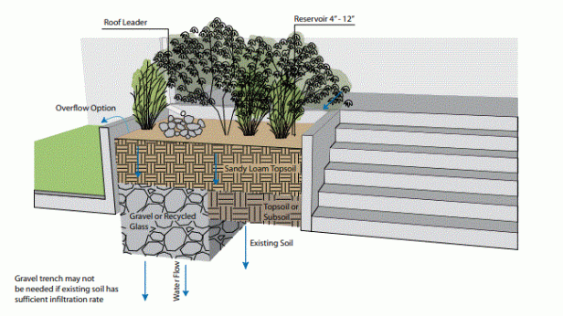 Un jardín de lluvia (o cuenca de biorretención) es un paisaje absorbente diseñado para un área baja, colocada sobre un tejido de geotextil que protege una capa de piedra subyacente de la sedimentación. Es una forma de bajo impacto para eliminar contaminantes de la escorrentía de aguas pluviales de superficies impermeables. La escorrentía que fluye hacia el jardín de lluvia se acumulará temporalmente antes de ser absorbida por los suelos de siembra, la capa de piedra y el suelo nativo. El mantenimiento no es más engorroso que para cualquier área ajardinada. Para garantizar un alto rendimiento continuo del jardín de lluvia, los suelos de la superficie compactada deben escarificarse periódicamente para mantener la tasa de infiltración.