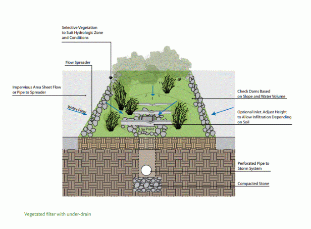 Los filtros vegetativos son áreas plantadas con suave pendiente y se recomiendan para su uso junto con instalaciones de biorretención (ver más abajo). Las aguas pluviales ingresan al filtro vegetativo a medida que fluye la lámina desde una superficie impermeable, y los materiales vegetales capturan sedimentos antes de que la escorrentía llegue al dispositivo de bioretención. El uso de un tampón con vegetación o tiras de filtro para tratar previamente la escorrentía de aguas pluviales ayuda a reducir el mantenimiento de un dispositivo de bioretención y prolonga su longevidad. Si el flujo se concentra, debe dispersarse sobre un área horizontal más grande (utilizando una presa de retención del esparcidor. Alternativamente, el área inmediatamente más allá del punto de entrada de flujo puede reforzarse con “piedra de choque” u otros medios no vegetativos de disipación de energía. Las obstrucciones deben despejarse y los sedimentos o la basura deben eliminarse regularmente. El filtro debe tener un mínimo de 20 ‘por 10’ con una pendiente máxima del 10%; El tamaño exacto se determinará en función del área tributaria, la lluvia y la tasa de infiltración del suelo nativo. Las plantaciones pueden variar desde árboles y arbustos hasta plantas perennes y pastos. Se recomiendan tuberías de desagüe y exceso de drenaje.