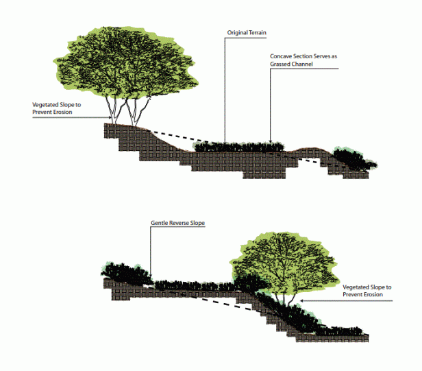Esta técnica consiste en remodelar las superficies inclinadas del suelo para controlar las aguas pluviales y minimizar la erosión. Los bancos son amplias terrazas que redirigen el flujo de agua a lo largo de contornos paralelos en lugar de permitir que el agua viaje directamente cuesta abajo. Esta técnica reduce la velocidad de la escorrentía, lo que reduce la probabilidad de erosión y minimiza la concentración de agua en el punto de recolección. El retraso en el tiempo de concentración es crítico para reducir los eventos de OSC. Esta técnica no debe usarse donde grandes áreas de vegetación existente deben ser protegidas ya que el efecto del corte y el relleno tendrá un impacto adverso en los grados existentes.