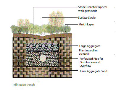 Se trata de sistemas integrados diseñados para imitar la hidrología y la ecología naturales, y se basan en sus procesos biológicos, físicos y químicos para reducir y tratar la escorrentía. área de infiltración Las áreas de infiltración son porciones de un sitio que exhiben la permeabilidad adecuada del suelo para ser utilizadas para capturar, filtrar e infiltrar agua de lluvia. Estas áreas pueden integrarse en el paisaje de un sitio para tener un carácter estéticamente formal o informal. Están diseñados para capturar la escorrentía de áreas impermeables y son efectivos en patios, plazas o islas de estacionamiento, o como zonas ajardinadas alrededor de un edificio.