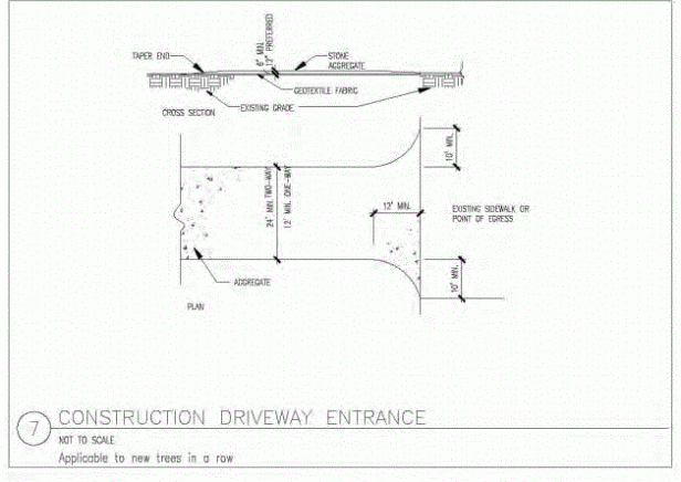 Ruta de acceso a la construcción, área de preparación para remolques, materiales y estacionamiento en el sitio y grúa / polipasto (si corresponde); · Área de acumulación de tierra vegetal y relleno (2 pilas diferentes basadas en cantidades aproximadas anticipadas) y acceso de vehículos a las pilas; · Área (s) a proteger y árboles individuales a proteger; · Detalles de un acceso de construcción / camino de acarreo, protección individual o masiva de árboles, cercas de limo, fardos de heno y otros controles de erosión y sedimentos. Cualquier desviación del debe ser señalado al Gerente de Proyecto de Construcción , Gerente de Construcción y Consultor de Diseño en la reunión de inicio del proyecto y se debe desarrollar un procedimiento para resolver conflictos antes de que el contratista pueda tener acceso al sitio.