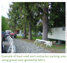 Una carretera de acarreo construida y ubicada adecuadamente es rentable y tendrá menos impacto adverso. Restrinja el tráfico en áreas sensibles o propensas a la compactación, y restrinja todo el equipo a pistas o carriles de tráfico específicos a través del sitio de construcción. Los carriles de acarreo deben prepararse previamente con un tejido de geotextil y 30 cms. de gravilla sobrecargada para minimizar la penetración de la compactación, desalentar la formación de surcos y facilitar la extracción después de la construcción.