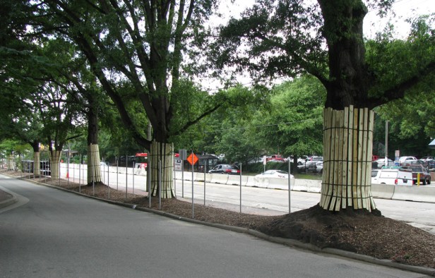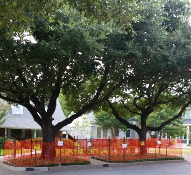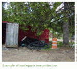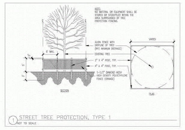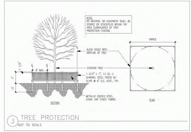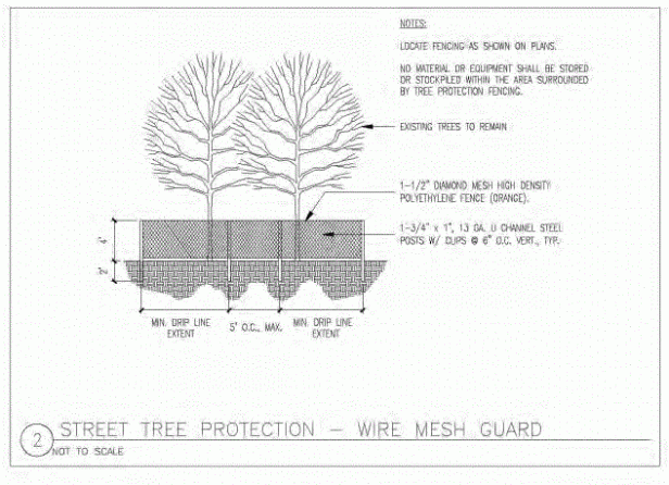 - En el diseño y los documentos, mostrar la protección de los árboles que se extiende al menos todo el perímetro de la copa de los árboles («línea de goteo»), y preferiblemente un pie radial por cada pulgada de calibrador para árboles tolerantes y 1.5 pies radiales por cada pulgada de calibrador para árboles sensibles Por ejemplo, un árbol de calibre de 30 requeriría una cerca de protección de árbol de 2´20 metros de diámetro para árboles tolerantes y 3.50 metros de diámetro para árboles sensibles;