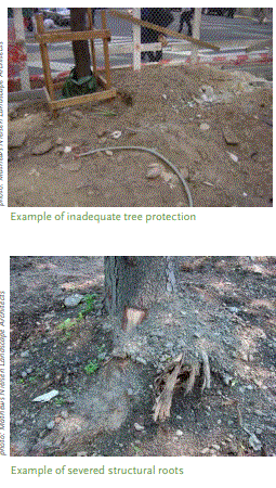 - Contratar los servicios de un técnico o arbolista certificado para ayudar con la evaluación de material vegetal viable y consultar sobre medidas de mitigación para proteger los árboles maduros;