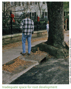 En algunos sitios, el suelo se ve aún más comprometido por contaminantes, como ácidos y cal, como resultado de malas prácticas de construcción y mantenimiento de edificios, y en algunos casos el vertido ilegal de productos químicos peligrosos. Espacio inadecuado para el desarrollo de la raíz