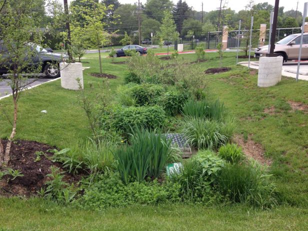 Bioswale: depresión de tierra colocada estratégicamente que captura el agua de tormenta y la filtra usando plantas de humedales nativas.