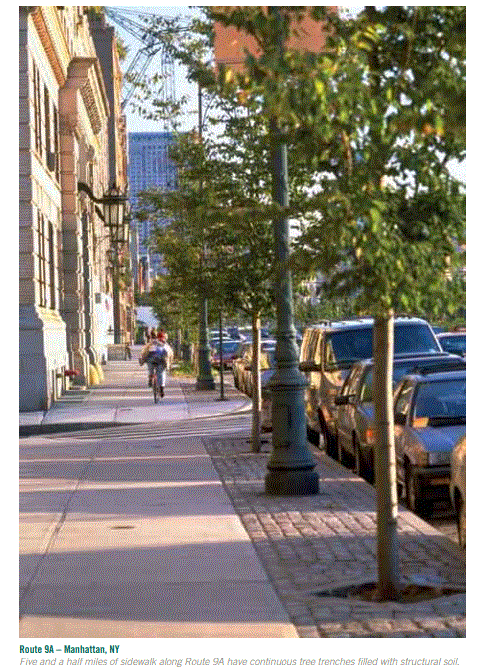Suelos estructurales: Nuevo desarrollo en el diseño de la estructura de plantación que utiliza roca triturada para obtener resistencia, con tierra que llena los espacios en la grava. Lo suficientemente fuerte como para soportar la pavimentación como el curso base, pero incluso cuando se compacta a toda su fuerza, tiene espacio para que crezcan las raíces de las plantas.