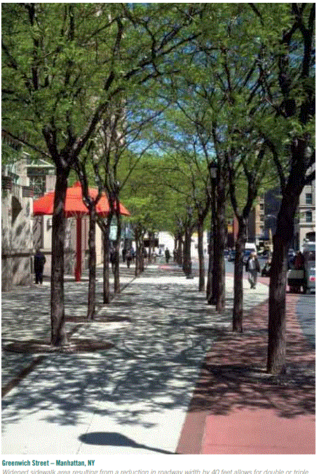 ˙ Diseñar un derecho de vía con área de pavimento impermeable reducida, pavimentos de alto albedo y sombra máxima por árboles ayudará sustancialmente a reducir la acumulación de calor urbano local, mejorar la calidad del aire, aumentar la durabilidad del pavimento y calmar el tráfico.