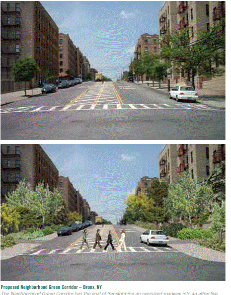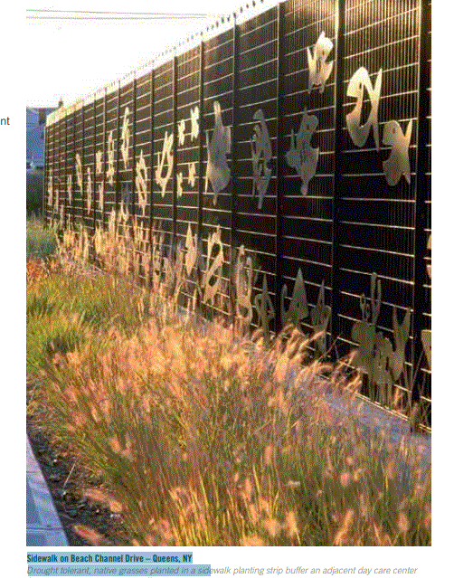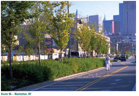 . Ejemplos de diseño integrado: ˙ El diseño de una carretera con una mediana central diversamente plantada que funcione como un dispositivo para calmar el tráfico y un área de biorretención de aguas pluviales mejorará la seguridad de los peatones, minimizará la escorrentía de las aguas pluviales, amortiguará el ruido de la calle y mejorará la calidad del aire. ˙