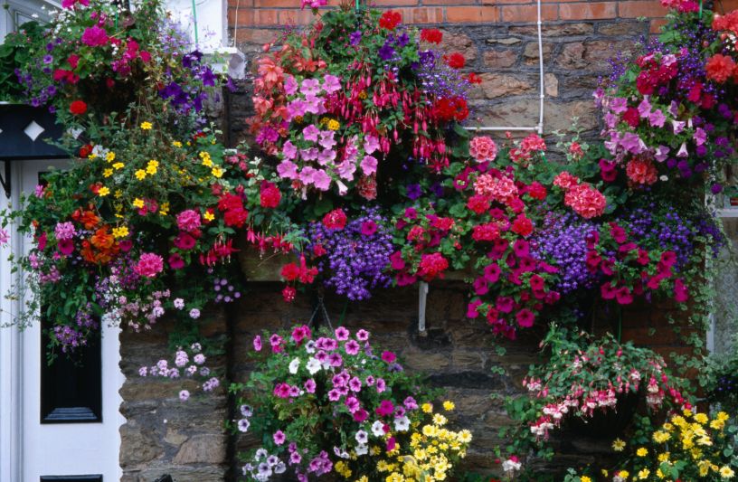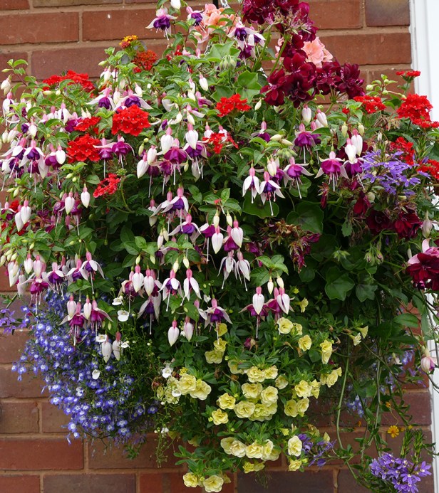 Argyranthemum , Lysimachia (jenny rastrera), Dichondra ‘Silver Falls’, Fucsia , Pelargonium (geranios) , Lobelia , Viola (pensamientos), Petunia , Salvia y Nicotiana (plantas de tabaco).etc…