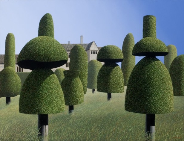 Los temas tradicionales para la topiaria generalmente han sido árboles de hoja perenne para mantener una característica permanente a lo largo de las estaciones.