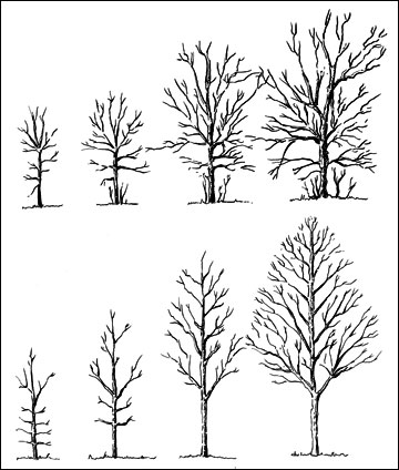Donde los árboles crecen con una rama central clara que crece hacia arriba de las otras ramas, es importante no cortar este líder central, ya que esto podría estropear la forma final del árbol.