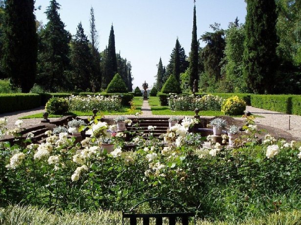 En macetas de terracota lucen las elegantes hojas de salón (Aspidistra elatior) y los geranios (Pelargonium sp.), al tiempo que las glicinias (Wisteria sinensis) y los rosales de Banksia (Rosa banksiae) cubren las pérgolas. En diferentes lugares de los jardines encontramos plantas aromáticas, como la lavanda (Lavandula angustifolia), el romero (Rosmarinus officinalis) y otras especies tapizantes como la hiedra (Hedera helix).