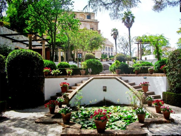 La parte posterior de la casa se asoma al profundo tajo que forma el Guadalevín a su paso por Ronda a través de terrazas ajardinadas a distintos niveles