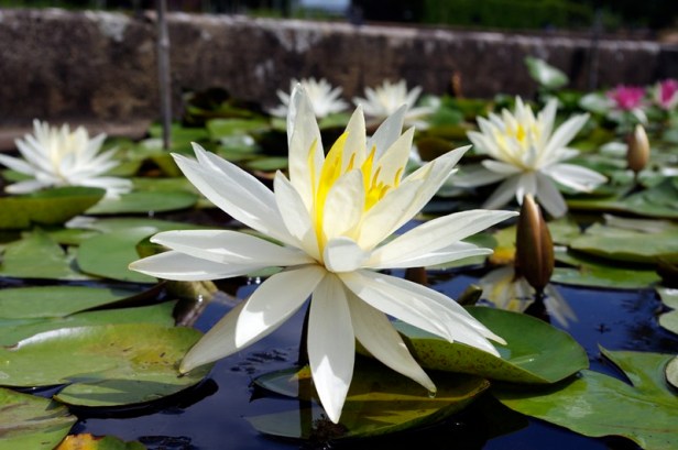 En el estanque desde antaño han lucido las ninfeas Nymphaea alba L especie tipo de la familia de las  Nymphaeaceae, igualmente plantas herbáceas acuáticas, reproducida por rizomas ,con hojas flotantes pocas veces emergidas, flores solitarias, blancas, amarillas, rosas, rojas o azules. Existen numerosos cultivares de las especies más utilizadas. Viven en su hábitat, en lagunas o charcas de agua dulce calmadas.