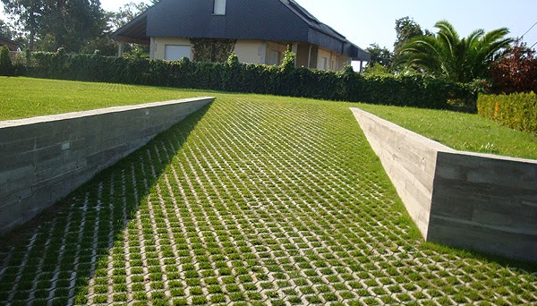 Césped reforzado: unidades estructurales entrelazadas que contienen huecos o áreas para el crecimiento del césped y son adecuadas para cargas de tráfico y estacionamiento mínimos. Las unidades de césped reforzado pueden consistir en concreto o plástico y están sustentadas por un sistema de drenaje de piedra y / o arena.