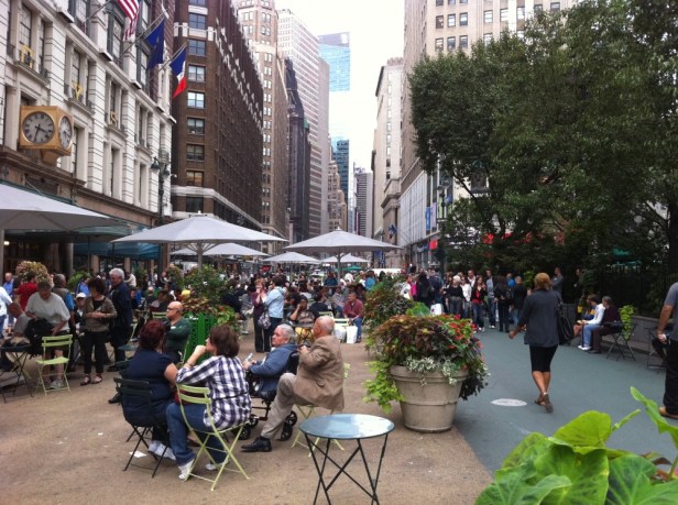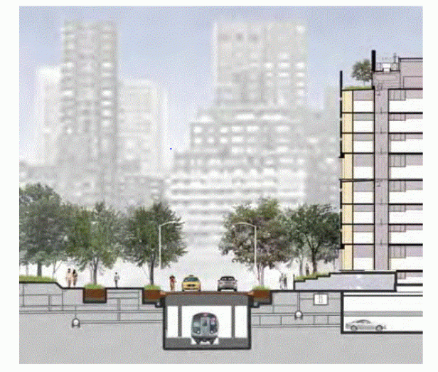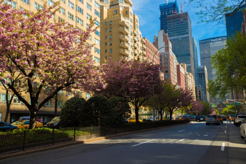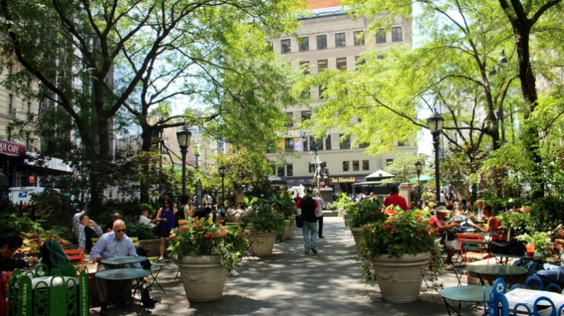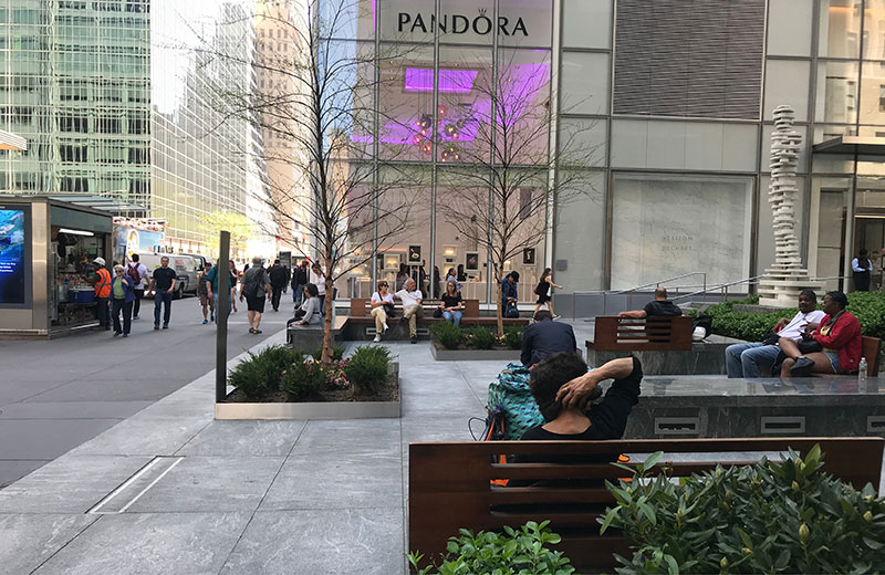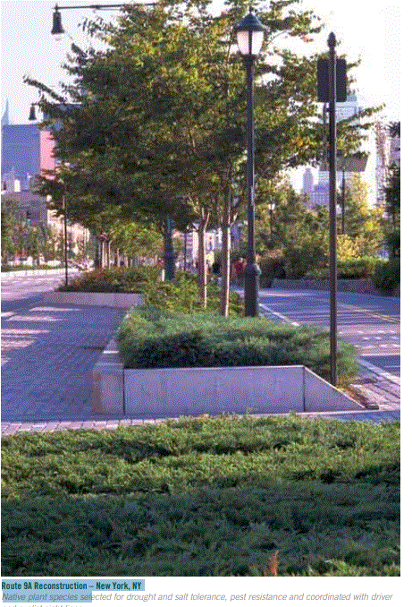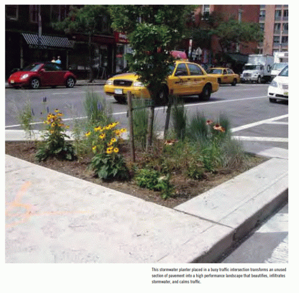 Greenstreets: un programa de toda la ciudad para convertir islas de tráfico pavimentadas y vacías y medianas en espacios verdes llenos de árboles de sombra, árboles con flores, arbustos y cobertura vegetal.