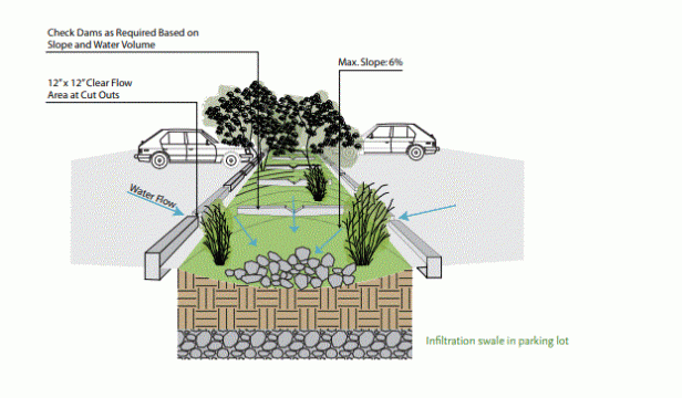 Bioswale: una depresión de tierra colocada estratégicamente que captura las aguas pluviales y las filtra utilizando plantas de humedales nativas.