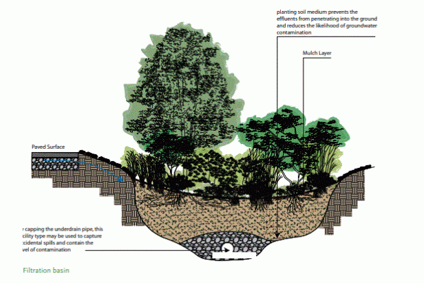 Biofiltración: una técnica de control de la contaminación que utiliza material vivo para capturar y degradar biológicamente los contaminantes del proceso. Los usos comunes incluyen la captura de productos químicos nocivos o limo de la escorrentía superficial. Ejemplos de biofiltración incluyen Bioswales, Humedales artificiales y Humedales naturales.