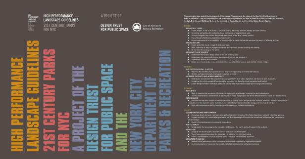 Pautas de construcción de alto rendimiento (DDC y Design Trust para el espacio público) – 1999 Manual de construcción y residuos de demolición (DDC) – 2003 Pautas de infraestructura de alto rendimiento (DDC y Design Trust para el espacio público) – 2005 Mitigación de la isla de calor de Nueva York con silvicultura urbana, techos vivos & Light Surfaces (NYSERDA) – 2006 PlaNYC (Alcaldía) – 2007 Cool and Green Roofing Manual (DDC) – 2007 Jamaica Bay Watershed Protection Plan (DEP) – 2007 Sustainable Urban Site Design Manual (DDC) – 2008 Sustainable Streets: DOT Strategic Plan para 2008 y más allá (DOT) – Plan de gestión sostenible de aguas pluviales 2008 (Oficina del alcalde) – Plan de acción y evaluación del programa de cambio climático 2008 (DEP) – 2008 Humedales de la ciudad de Nueva York: vacíos normativos y otras amenazas (Oficina del alcalde) – Diseño de calles 2009 Manual (DOT) – 2009 Manual de Diseño de Sitio Urbano Sostenible (DDC) – Pautas de Diseño Activo 2009 (DOHMH & DDC) – 2010