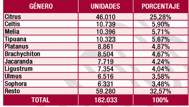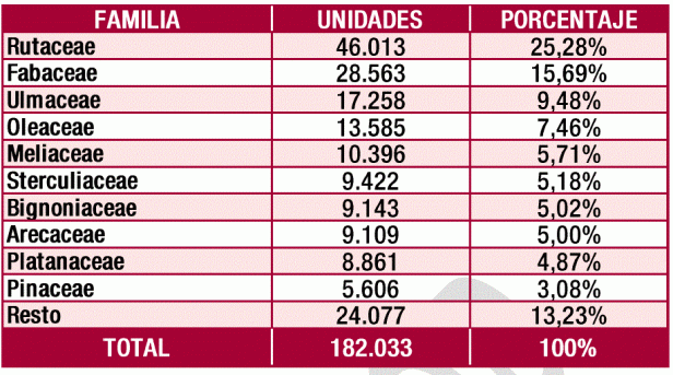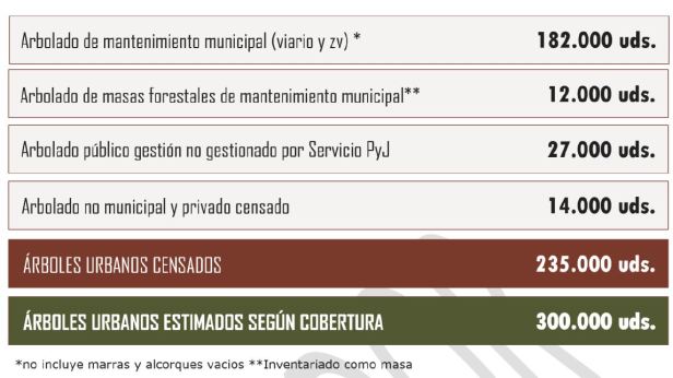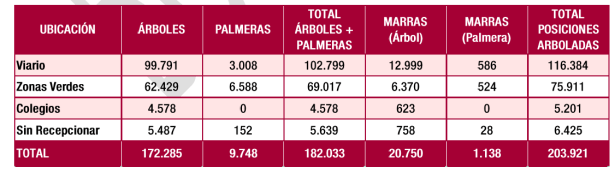La información registrada en el inventario municipal de arbolado urbano en el momento de la redacción del presente Plan Director nos dice que la ciudad cuenta con 172.285 árboles y 9.748 palmeras.