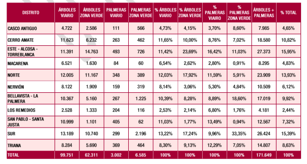 El arbolado urbano de mantenimiento municipal de la ciudad comprende 253 especies y variedades diferentes. Una sola especie, el naranjo amargo (Citrus aurantium), supone casi el 25% del total. Es, con diferencia, la más representada en cada uno de los distritos, superando el 35% en Casco Antiguo, Macarena, Nervión y San Pablo-Santa Justa.