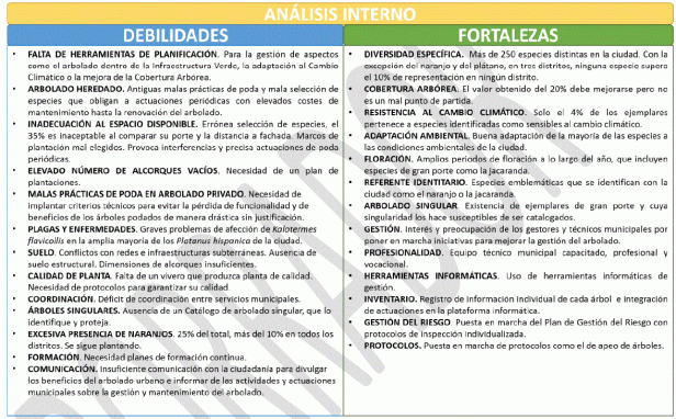 El análisis interno, se corresponde con las fortalezas y debilidades del conjunto del arbolado de la ciudad. Básicamente son las valoraciones extraídas desde cada una de las perspectivas analizadas, destacando por un lado sus factores más positivos: fortalezas; y, por otro lado, aquellas circunstancias más desfavorables y potenciales de riesgo: debilidades
