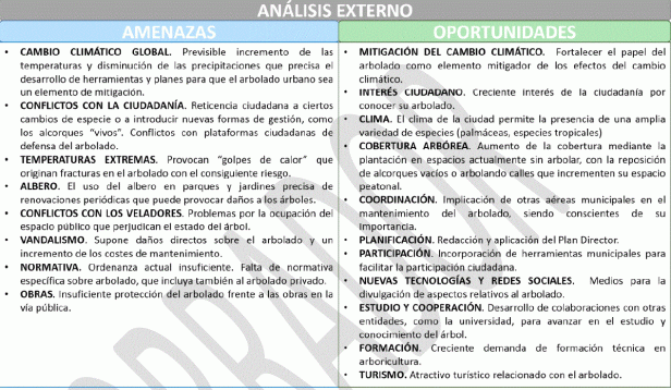 El análisis externo busca la influencia de todos aquellos aspectos que rodean al arbolado e identifica aquellas amenazas y oportunidades de cara a poder realizar posibles cambios sobre la situación actual