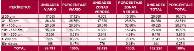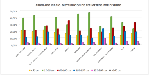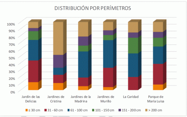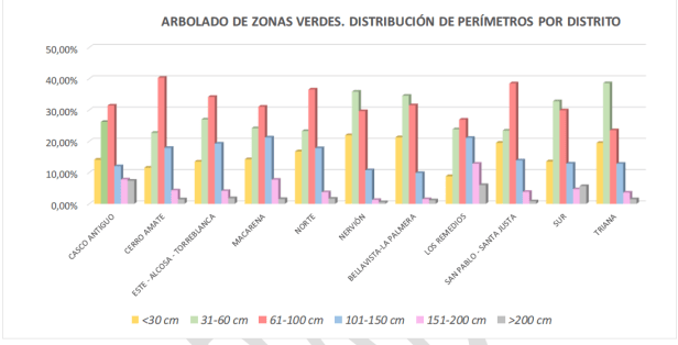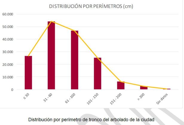 En viario el perímetro de tronco medio es algo inferior al de zonas verdes, siendo mayoritario el intervalo 31-60 cm (36%), mientras que en zonas verdes es el de 61-100 cm (33%).
