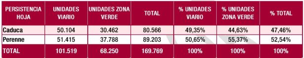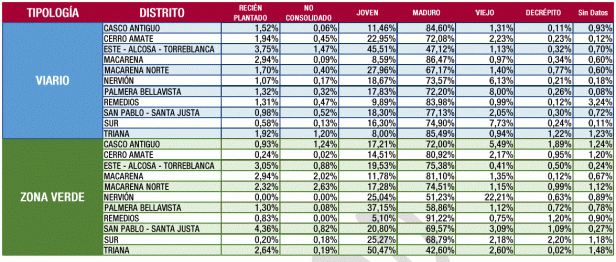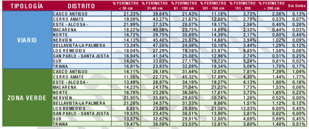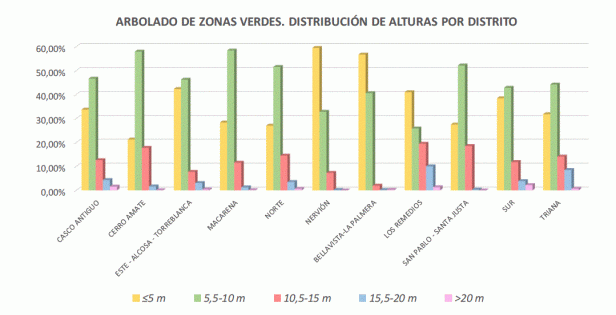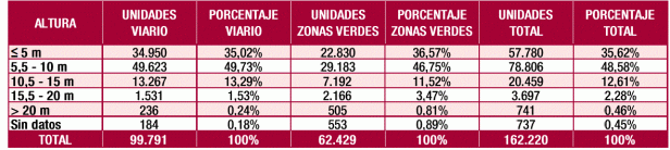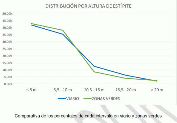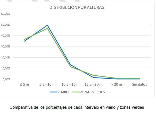 En zonas verdes la cantidad de árboles grandes es mayor que en viario, llegando al 5% de los incluidos en esta tipología. No obstante, la distribución en viario y zona verde no ofrece, apenas, diferencias significativas.