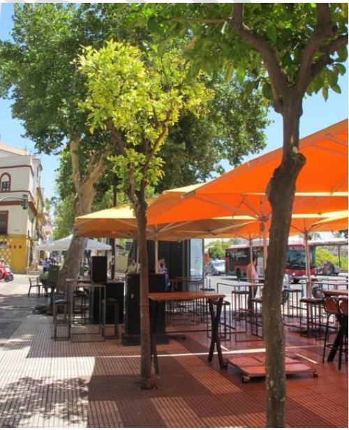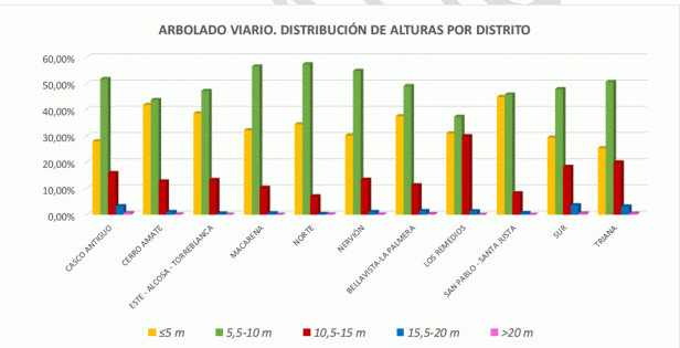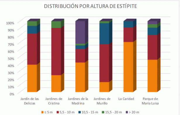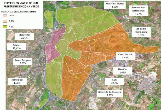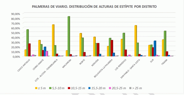 Se trata de una especie emblemática, que aporta identidad al paisaje de la ciudad, pero su uso con profusión, no solo en las calles del núcleo histórico de Sevilla, sino en multitud de zonas verdes y espacios viarios de la periferia, se revela excesivo. En el caso del viario, asciende hasta el 33% y en zona verde disminuye al 11%.