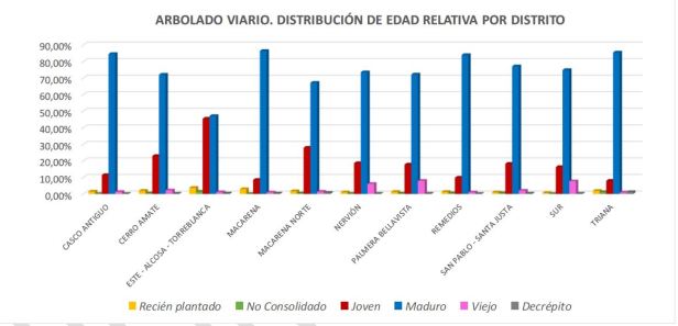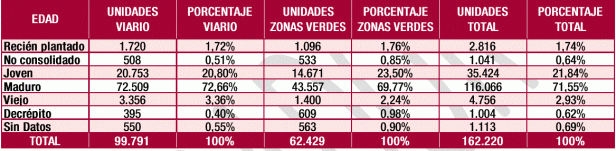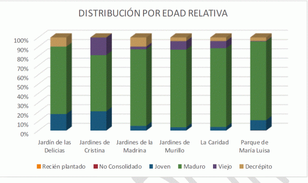 Según los datos de edad relativa, la gran mayoría, el 71,5% de los ejemplares de la ciudad se ha clasificado como maduro. El 22% joven, el 3,5% viejo o decrépito y el 3% recién plantado o no consolidado.