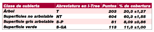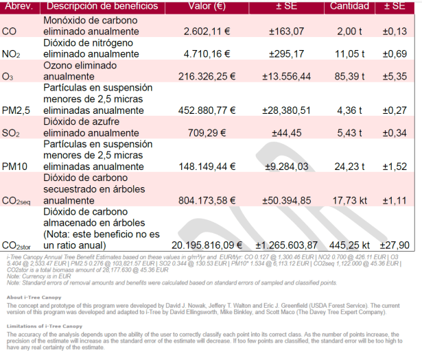 Mediante la herramienta i-Tree se ha calculado la cobertura arbórea, aproximadamente, en un 20% sobre la superficie urbana. Dato que no se aleja en exceso de la media de otras ciudades en las que se ha aplicado el mismo método.