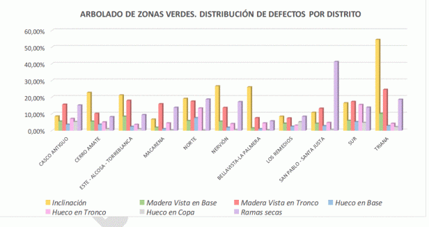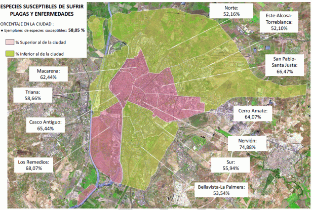 - Susceptibles de sufrir plagas y enfermedades: Aunque con notables diferencias en el grado de afección, las consecuencias, si son tratadas o no, los ejemplares de especies con plagas o enfermedades cuya presencia en el arbolado urbano de Sevilla ha sido constatada representan el 58%