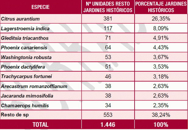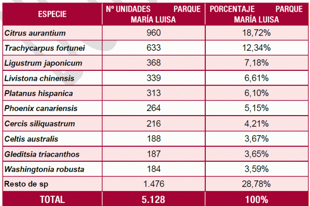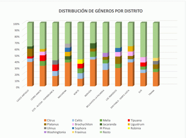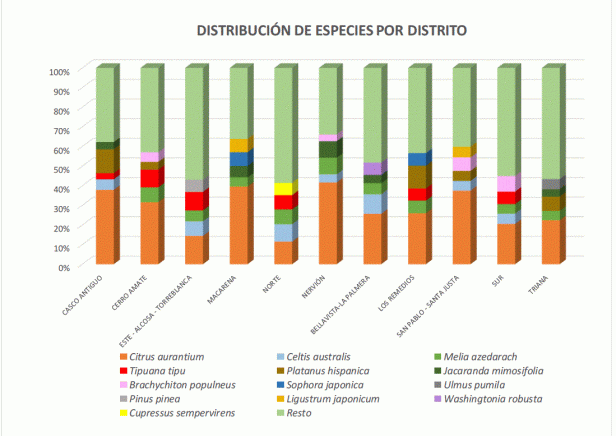 Ninguna otra supera el 10% en la ciudad. A continuación, Celtis australis, Melia azedarach y Tipuana tipu, en torno al 5% cada una. Puntualmente, una segunda especie supera el umbral del 10% en algún distrito. En concreto, Platanus hispanica en Casco Antiguo (12%) y Los Remedios (11%).