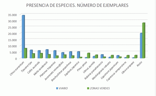 En conclusión, la cantidad de especies existentes es amplia, pero el predominio del naranjo es excesivo. Debe planificarse la reducción del número de naranjos, definiendo los criterios de las zonas en las que mantenerlo y de las zonas en las que sustituirlo. Asimismo, con el cambio climático como escenario ineludible, debe planificarse la configuración específica del arbolado para su adaptación paulatina, ampliando el abanico de especies a plantar y sustituyendo progresivamente aquéllas con mayor vulnerabilidad.