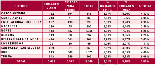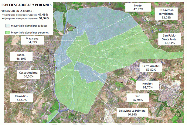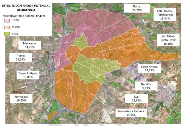 - Especies alergénicas: Se han identificado como especies con mayor potencial alergénico las pertenecientes a las familias Cupressaceae, Oleaceae, Platanaceae y Ulmaceae. Los ejemplares del arbolado urbano de Sevilla pertenecientes a estas especies suponen el 17,43% del total.