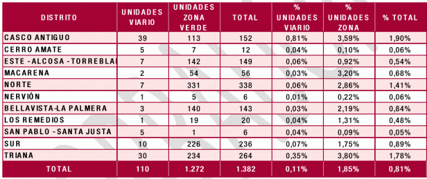 Atendiendo a la ubicación en viario y zona verde, los porcentajes de cada categoría son muy parecidos a los obtenidos para el conjunto de la población.