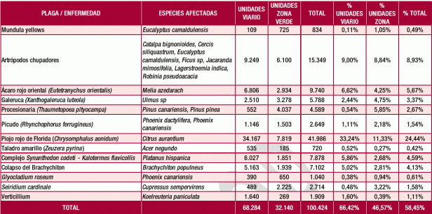 - Problemas de plagas y enfermedades con afecciones graves o muy extendidas, como los efectos del complejo Synanthedon-Kalotermes en la población de plátanos.
