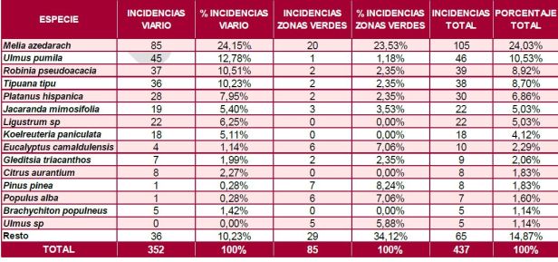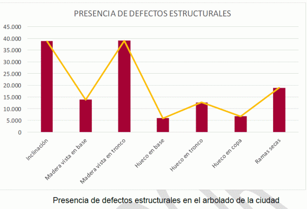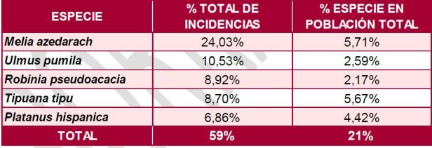 - Incidencias por fallo estructural: Las cinco especies que han sufrido más incidencias (en conjunto contabilizan el 59% de las incidencias) representan el 21% de la población arbolada. Son Melia Azedarach, Ulmus pumila, Robinia pseudoacaia, Tipuana tipu y Platanus hispanica
