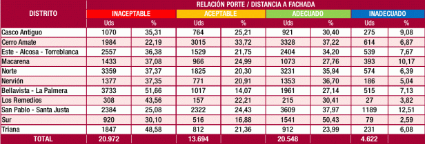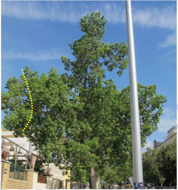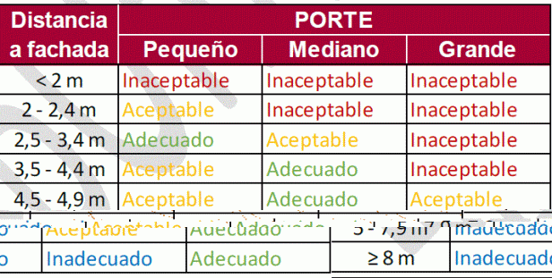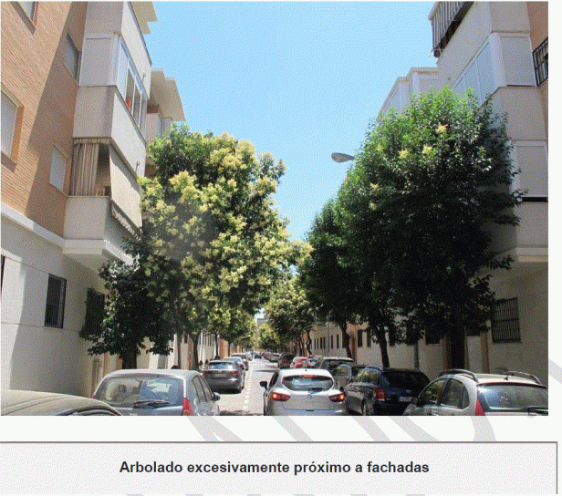- Inadecuación del arbolado al espacio disponible por una mala elección de especie en el momento de plantación. Según el análisis realizado, para el 35% del arbolado viario la relación entre su porte y la distancia a fachada es inaceptable.