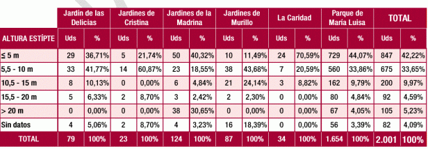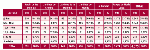 Respecto a los datos de altura, casi el 50% se encuentra en el intervalo de 5,5–10 m y el 35% con menos de 5 m. Árboles por encima de 15 m solo suponen el 3%.