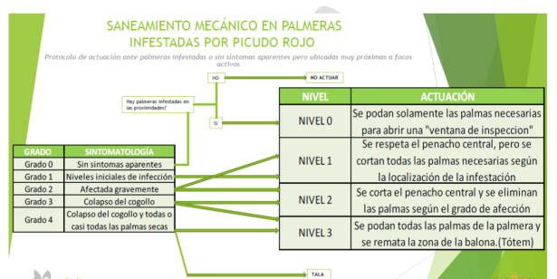 El saneamiento biomecánico, consistirá en la eliminación mecánica de las partes infectadas para destruir el insecto en todas sus formas, sin tocar la yema terminal o el estípite. Para evaluar de una manera estimada el grado de infección de las palmeras previa a la intervención hemos desarrollado cinco niveles de infección, basándonos en los síntomas previos que se presenten, y serán los siguientes:
