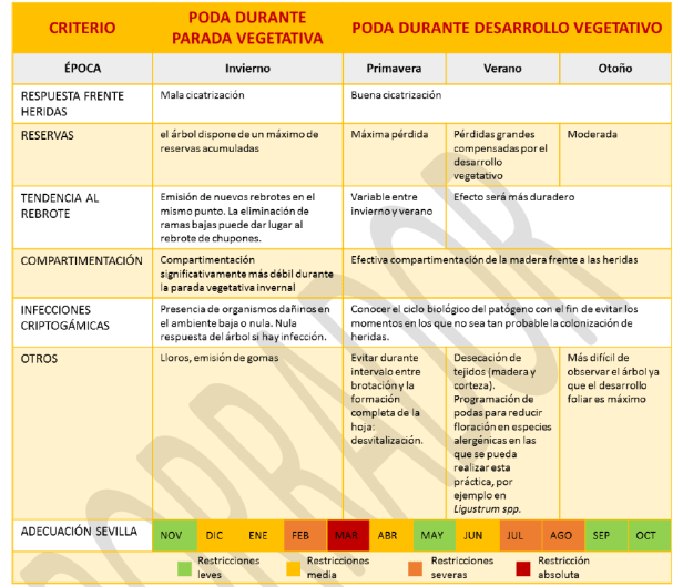 Por otro lado la poda de arbolado es una de las más importantes labores de mantenimiento del arbolado y es probablemente la que exige un mayor conocimiento técnico para su ejecución ya que para realizar una poda correcta es fundamental poseer una profunda comprensión de la biología del árbol y un conocimiento de la fenología y biología de los distintos agentes patógenos que puedan colonizar tejidos a través de heridas y de los hongos de pudrición más comunes en el arbolado urbano de Sevilla que pueden condicionar la época de ejecución de las podas