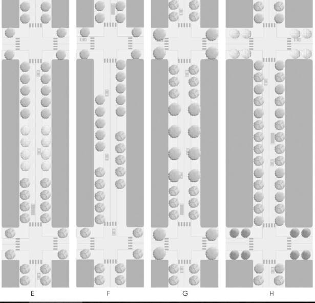 • Alterar la cadencia. Alteramos las distancias a la vez que cambiamos de especies. Reducimos o aumentamos la densidad del paseo en función del efecto que queramos conseguir o de la calidad del paisaje urbano.