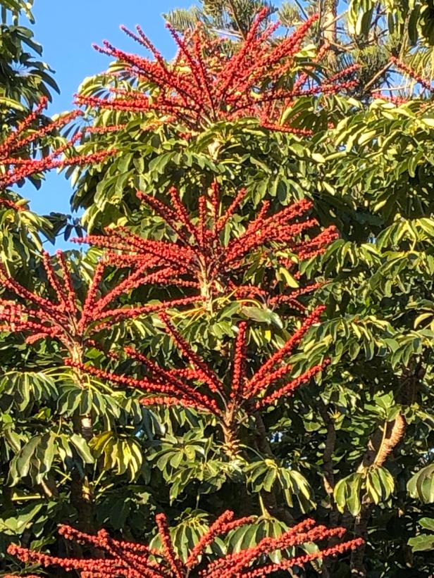 Almuñecar.-Parque El Majuelo.-.-Schefflera actinophylla = Brassaia actinophylla en flor.-Arbol pulpo australiano